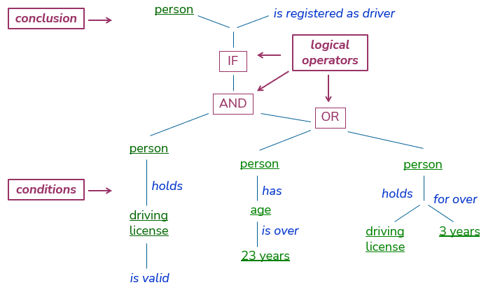 This is possible on condition that, "behind” the natural-language form, the rule has a formal logical structure. In other words, the rule can be considered or rewritten as a formal structure. The main building blocks of the structure are logical operators (IF, THEN, ELSE, AND, OR, NOT) and noun concepts and verb concepts: