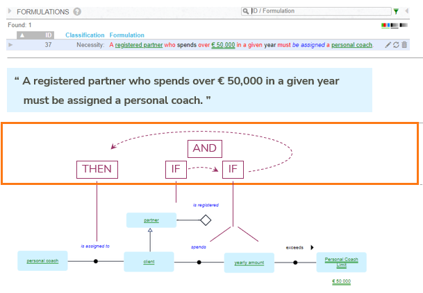 Concept structure and logical structure together determine the meaning of the rule, but they are both underlying structures: it is not what you see at the surface. What we see at the surface is just an English sentence, except that concept structure is reflected in colour-coding in the USoft Studio tool (topmost layer).
