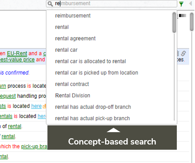 USoft Studio has a powerful search engine. You can search by words and word combinations as in a normal search engine, but at the same time, you can also search by the concepts that the interpreter has recognised:
