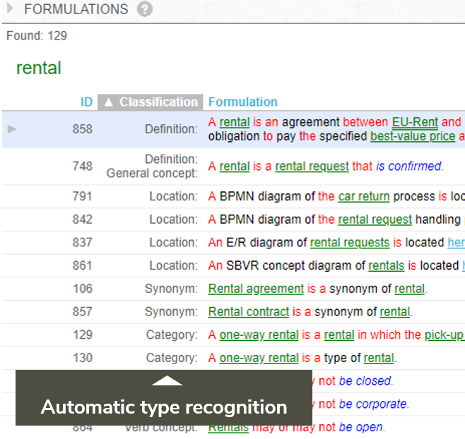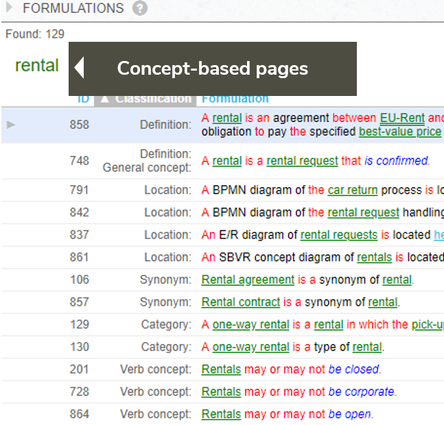 Colour-coded words become hyperlinks automatically. This enables you to navigate conveniently between the terms, definitions, business rules and diagrams that you create: