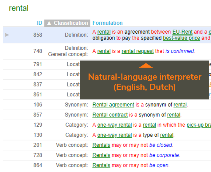 At the heart of USoft Studio is an interpreter that has knowledge of English and Dutch grammar. All you need to do is type sentences in everyday English or Dutch. The interpreter will immediately process and structure everything you type. In particular, the interpreter will recognise business terms and structures that you have already defined. It will signal the concepts it has recognised by colour-coding them. If you have provided a definition, it will be shown to all users hovering the concept with their mouse.