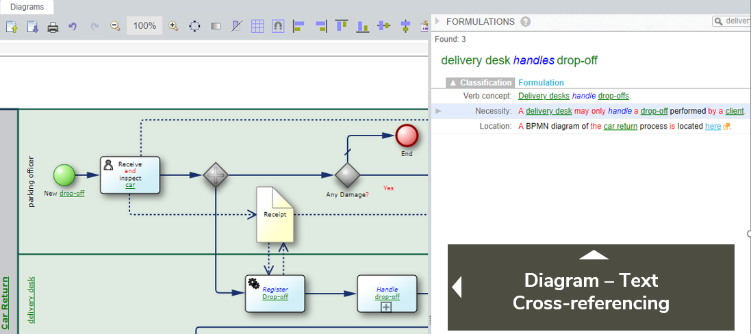 Any text that you use in diagram drawings is automatically cross-referenced with the text you use in terms, definitions and business rules. Navigation between the two is offered as soon as you click.