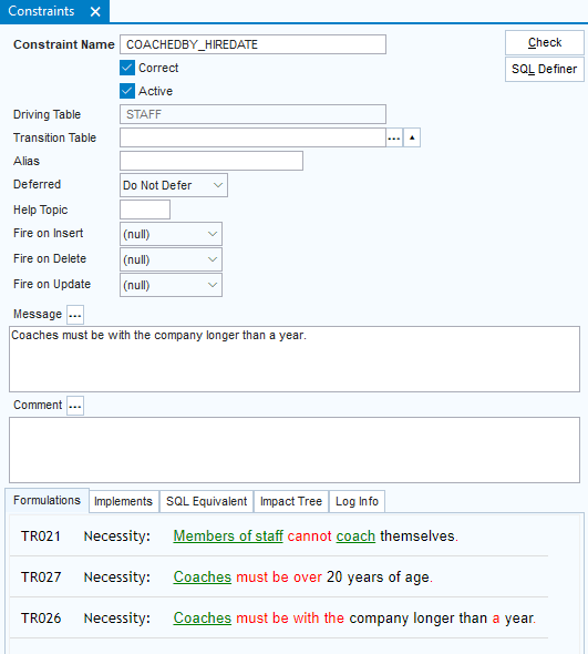 Formulations appear on "Formulations” tabs in windows showing implementations, for example in the Constraints window. A "Formulations” tab works in tandem with the "Implements” tab right next to it. The formulations shown correspond to what you select in the "Implements” tab. As long as you do not populate the “Implements” tab, nothing will show in the “Formulations” tab.