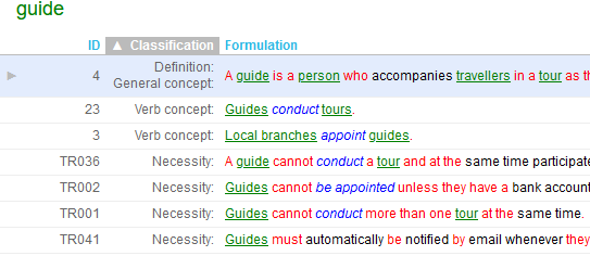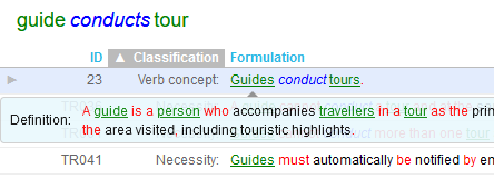 USoft Studio offers automatic colour-coding that shows this underlying structure. Verb concepts appear in blue italic type. Noun concepts appear in green underlined type. You can click on blue and green words to get more information about a colour-coded concept: