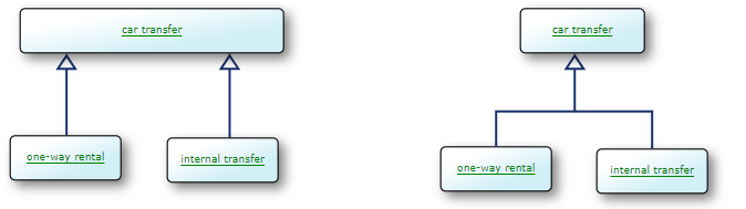 A concept can have 2 or any higher number of categories. If categories are mutually exclusive (a segmentation), they share the same arrowhead. The picture on the right is equivalent to the picture on the right except that it implies that a one-way rental is never also a car transfer: