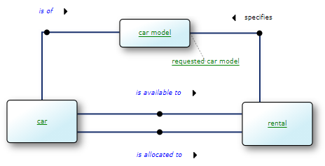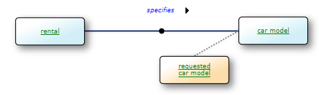 • Any text used in the diagram is automatically linked to concepts known in USoft Studio project. As a consequence, any text that is NOT green or blue in the diagram is guaranteed NOT to exist as a concept. The fact that "specifies" in the example diagram at the top of this article is black and not green, tells you that there currently exists no such concept as 'rental specifies car model'.