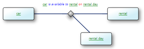 The USoft Studio language engines that process and colour-code formulations are not capable of recognising n-ary verb concepts in natural language. As a consequence, an n-ary verb concept is unlikely in USoft Studio to be colour-coded as intended. In SBVR documents, n-ary verb concepts are commonly colour-coded with an alternation of green and blue text, but no red or black text: caris available torentalonrental day