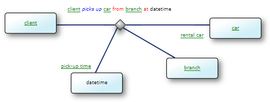 N-ary verb concepts are verb concepts ("blue concepts") that involve noun concepts ("green" concepts) in more than 2 places. Each noun concept involves plays a role in the verb concept. N-ary verb concepts are depicted by a diamond and as many boxes as there are noun concepts involved. The diagram is connected to each of the boxes: