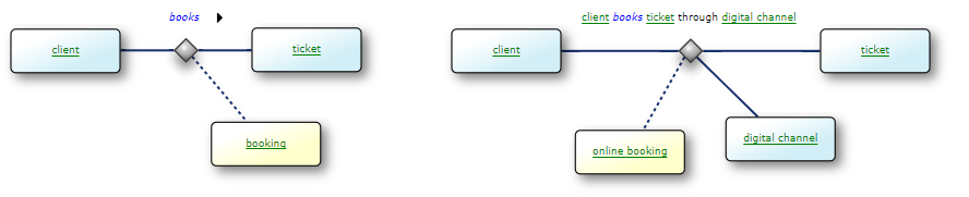 Binary verb concepts, or binary fact types, are verb concepts ("blue concepts") that involve noun concepts ("green" concepts) in 2 places. Each noun concept involves plays a role in the verb concept. Binary verb concepts are depicted by a line connecting 2 boxes:
