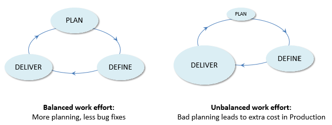 The picture on the right visualises that, if your way of working is unbalanced, this is almost always because too much time is spent on tasks in the DELIVER phase, especially on bug fixing.