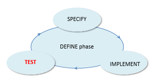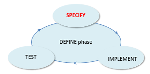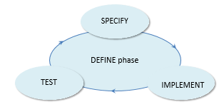 The tasks to be completed in the DEFINE phase are SPECIFY, IMPLEMENT and TEST: