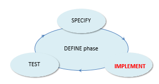 Completing an IMPLEMENT task leads implementations, which include structure, rules and interfaces. In iterations of the DEFINE phase, implementations are tested and possibly changed until they pass all tests and work according to the specification.