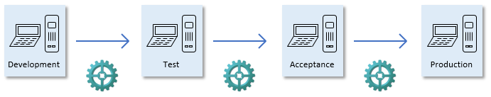 'DTAP street': 4 environments that Delivery Manager manages software delivery betweenYou can choose to have more or fewer environments than the 4 environments depicted here. In early stages of a project, and in prototyping situations, it is common to have a single environment for Test and Acceptance. In a large project we often see multiple extra environments for different purposes, such as training, sales demos, separate environments for functional testing, performance benchmarking, debugging, and delivery of emergency Production fixes.