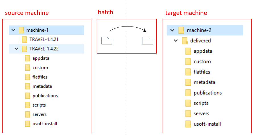 Picking up version 1.4.22 of application TRAVEL from the hatch and placing it on a target machineMaybe the USoft installation (in delivered folder "\delivered\usoft-install") must be executed by the server administrator, but database scripts (in delivered folder "scripts") must be run by a DBA. With file-based hatches, it is easy to achieve this type of task division. Each party picks up the deliverables that she is responsible for deploying.