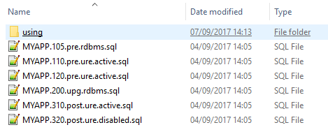 • At most 1 file, always with sequence number 200, has "upg" and is known as the create-tables script.
