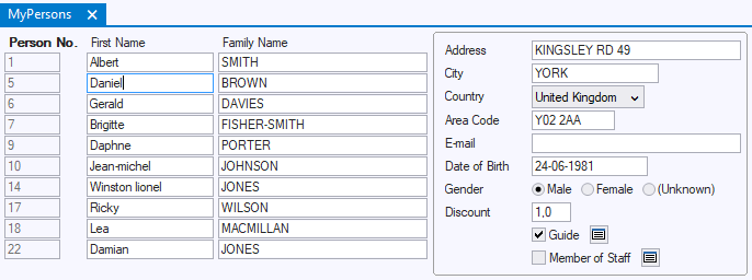 In the example, the current record is that of Person No. 5. The single-record secondary info box on the right shows details of this person. If the user clicks in the record for No. 6, it will show details of person no. 6. The user can supply new (INSERT) or updated (UPDATE) values in both boxes. USoft will automatically associate input into both boxes with the same database record.