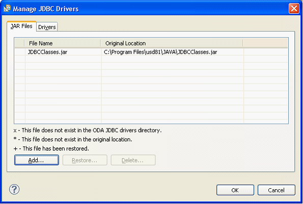 9. If JDBCClasses.jar is not listed in the Manage JDBC Drivers dialog, Press the Add button to browse for the file in question in the USoft JAVA folder. Then click OK. You will now be able to select com.usoft.jrec.JrecDriver as the JDBC Driver Class in the JDBC Data Source profile.
