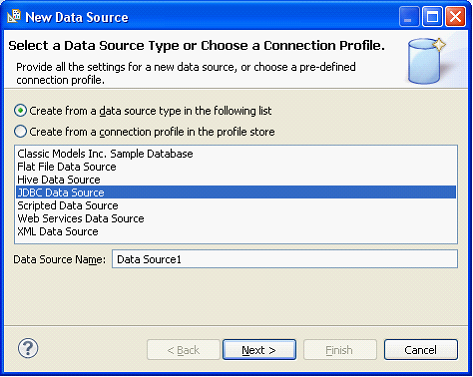 6. The New Data Source dialog will be displayed. In this dialog, Choose JDBC Data Source, provide a Data Source name, or accept the default value, and click next.