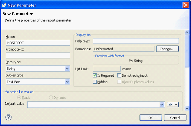 2. The New Parameter dialog appears. In the Name field of this dialog, type the name HOSTPORT and press OK.