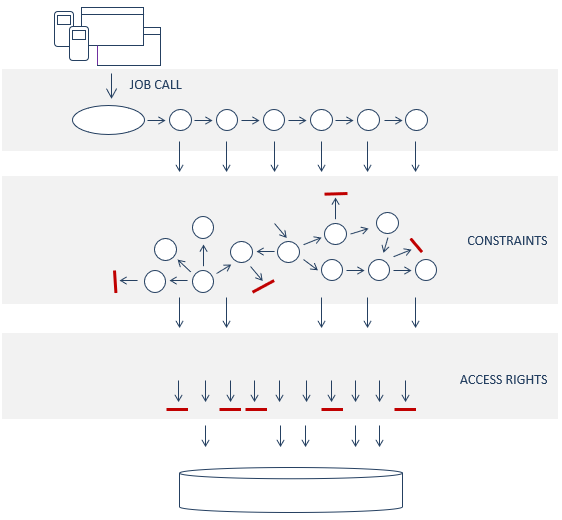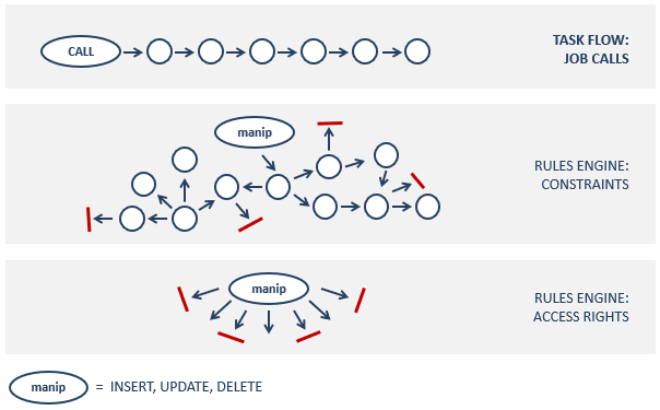 In a job, steps are taken, branches chosen and loops repeated in a strict predefined processing order. This sets task flow apart from the workings of the underlying Rules Engine, a piece of software that reacts to data manipulation in a non-procedural fashion by enforcing both constraints and access rights. Depending of direction "from which" the client is coming, the Rules Engine is able to react in different ways: