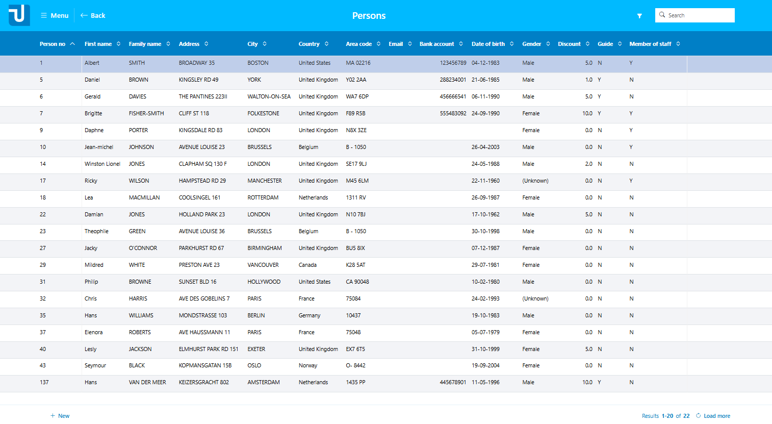 Here is an impression of a default multi-record grid for an InfoPage on table PERSON: