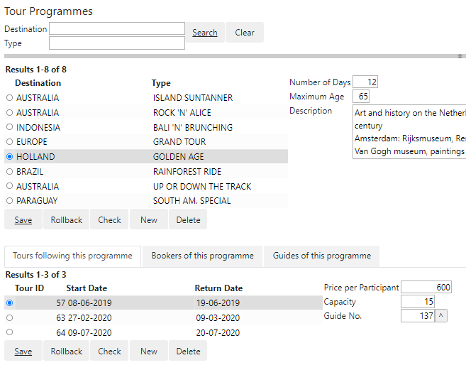You can display related information on tab pages. Here is an example where Tours, Bookers and Guides of the selected Tour Programme are displayed on 3 tabs at the bottom of the page. In this particular example, the tabs contain related queries on child tables of the Tour Programme table. As a result, the content shown in the tabs changes ("moves along”) with the selection the user makes in the top box: