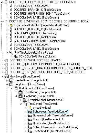 In this figure, the TreeControl has one root node: Schoolyear. This node is bound to 'DOCTREE_SCHOOLYEAR/SCHOOLYEAR_LABEL'. It has one child node: GoverningBody.
